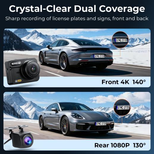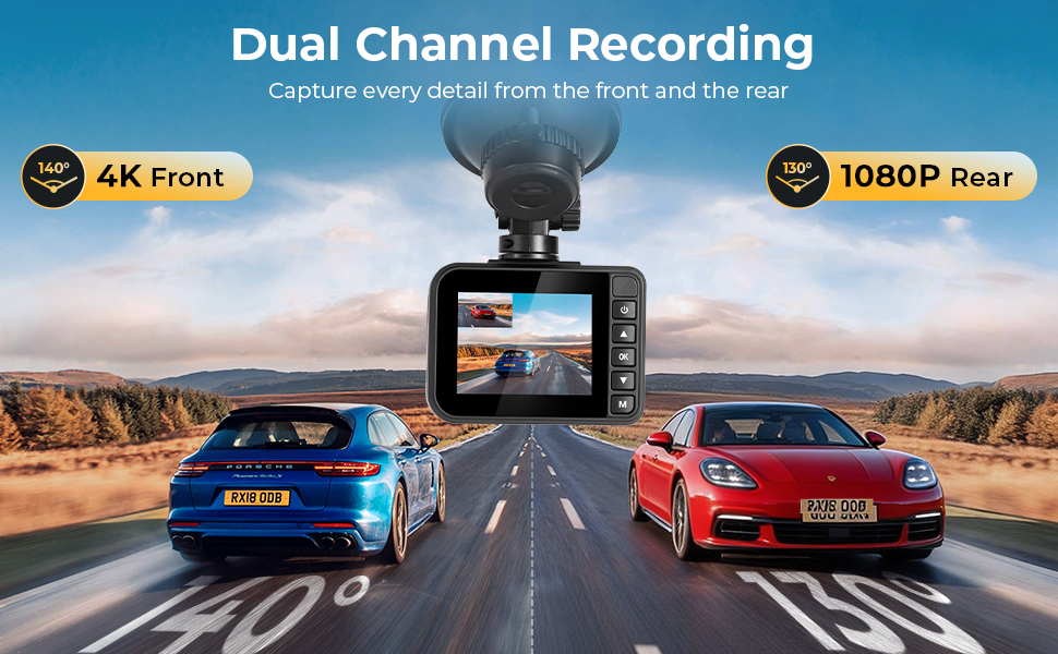 - Elevate your driving experience with the confidence that every mile is securely recorded. Our advanced 4K Dual Dash Cam captures the road ahead in stunning Ultra HD 4K and the rear in crystal-clear 1080P, ensuring license plates and road signs are legible day or night.