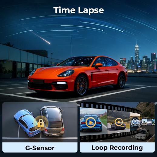 Smart Time Lapse mode captures video at a low bitrate while your car is parked, compressing hours—or even days—into short, easy-to-review clips. Gain up to 10× more storage efficiency, letting the dual dash cam monitor longer. A shopping cart hits your door? Spot it in seconds, not hours. Skip the wait—focus only on what matters.