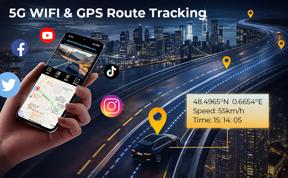Built-in 5G WiFi connects instantly to your smartphone for smooth real-time preview, lightning-fast downloads, and effortless sharing—up to 3× faster than traditional 2.4G WiFi cameras. Meanwhile, the integrated GPS module automatically records your route, speed, location, and timestamp on every clip. Every detail of your journey is captured, mapped, and ready to relive.