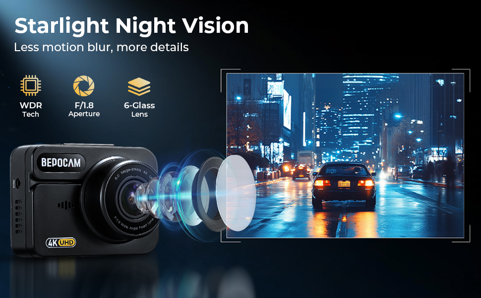 - Powered by Starlight Night Vision and a 140° Wide Angle lens, the 4K dash cam eliminates blind spots and pierces through the darkness. But protection doesn’t stop when you park; the 24H Parking Monitor and G-Sensor stand guard while you sleep, locking critical evidence instantly upon impact. With Built-in GPS and High-Speed 5G WiFi, accessing your route data and footage is faster and easier than ever. Drive smarter, park safer, and never miss a moment.