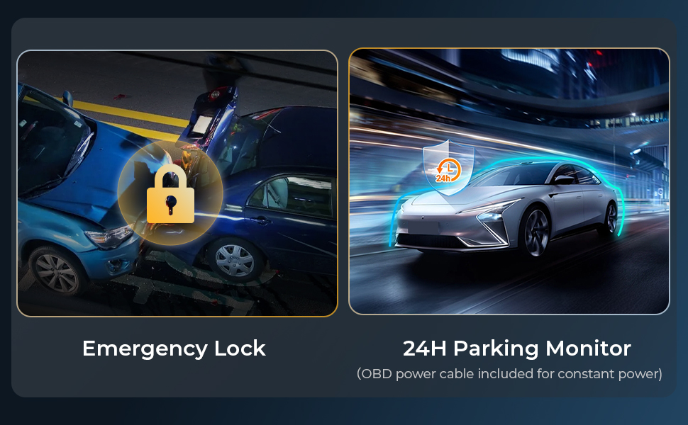 - * [24/7 Parking Mode & G-Sensor] Stay protected around the clock with two smart parking modes: time-lapse recording for extended monitoring and G-sensor activation for collision detection. Important clips are automatically locked to preserve crucial evidence. An OBD power cable is included for stable, continuous power without complicated hardwiring.