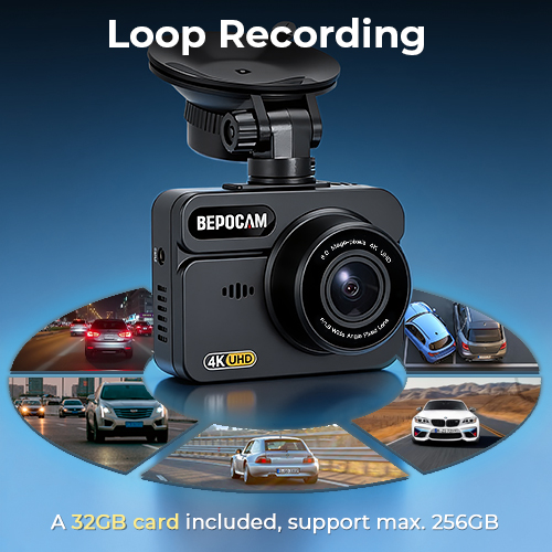 Loop Recording captures continuously, automatically overwriting old footage so you never run out of space. With support for up to 256GB and a 32GB TF card included, your dash cam with gps is ready to protect your car from the first drive.