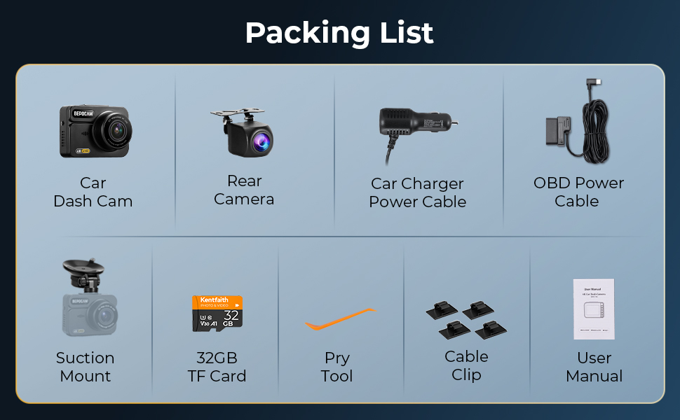 - * [Loop Recording & 32GB Card Included — Ready to Go] Kentfaith car camera front and rear features seamless loop recording to ensure uninterrupted coverage, automatically overwriting the oldest files when storage is full, while keeping emergency clips safely locked and protected. A free 32GB memory card is included, with support for up to 256GB—just install and start recording right out of the box.