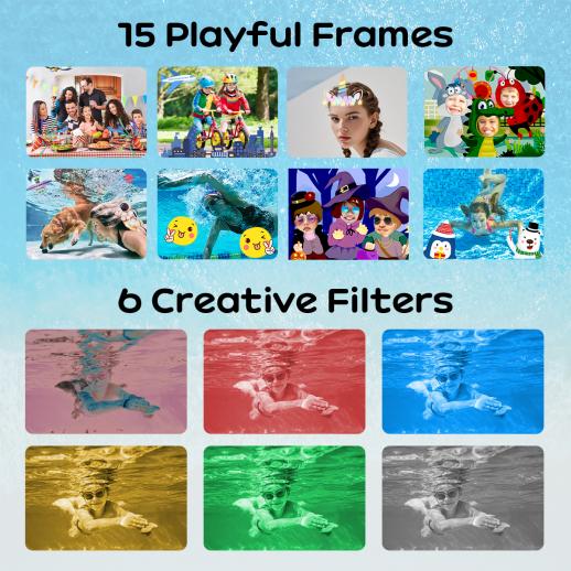 Built for curious kids and underwater fun! This tough, waterproof camera captures 48MP photos and 1080P HD videos up to 5m/16FT deep. Featuring 16X zoom, a 2.4" screen, autofocus, and a built-in flash, it ensures sharp, bright shots—even underwater. With 15 playful frames and 6 filters, kids can personalize every picture. Durable, drop-resistant, and easy to use—perfect for beach days, swimming pools, water parks, or everyday adventures.