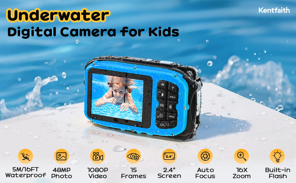 - * 【Auto-Focus & 16X Zoom | 15 Fun Frames & 6 Creative Filters】Capture every splash and smile with the Kentfaith kids’ digital camera! One-button auto-focus and up to 16X digital zoom make it easy for kids to snap sharp close-ups of sea creatures, friends, or distant fun. With 15 playful photo frames and 6 vibrant filters, your little photographer can add creativity to every shot.