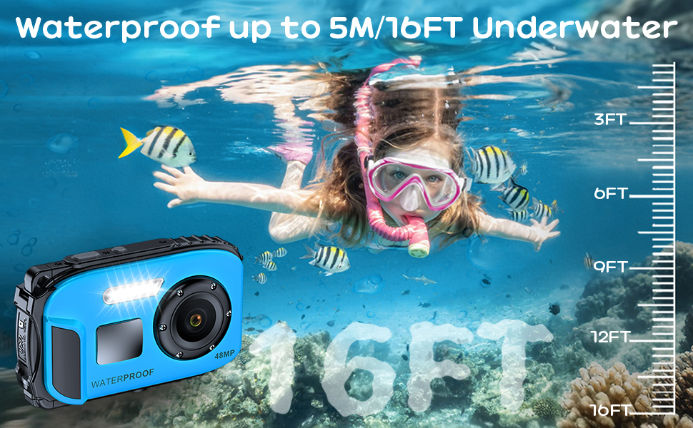 - * 【Waterproof Up to 16FT – Built for Splashy Fun】Designed for young explorers! This IP68-certified kids' underwater camera for kids lets your child dive up to 16 feet (5 meters)—perfect for swimming, beach vacations, snorkeling, and pool parties. Capture every underwater adventure worry-free! Note: Don't forget to put the waterproof plug in place before going to the water!