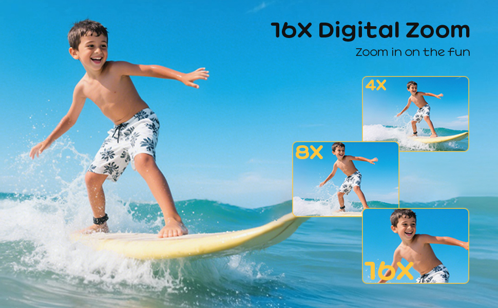 With 16X digital zoom, young explorers can bring distant underwater wonders up close without leaving their safe zone. Whether it's a shy fish or a faraway splash, they’ll capture the moment in sharp detail while staying safe.