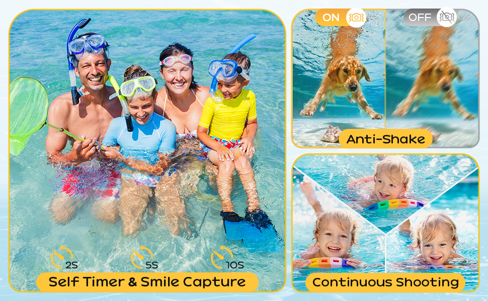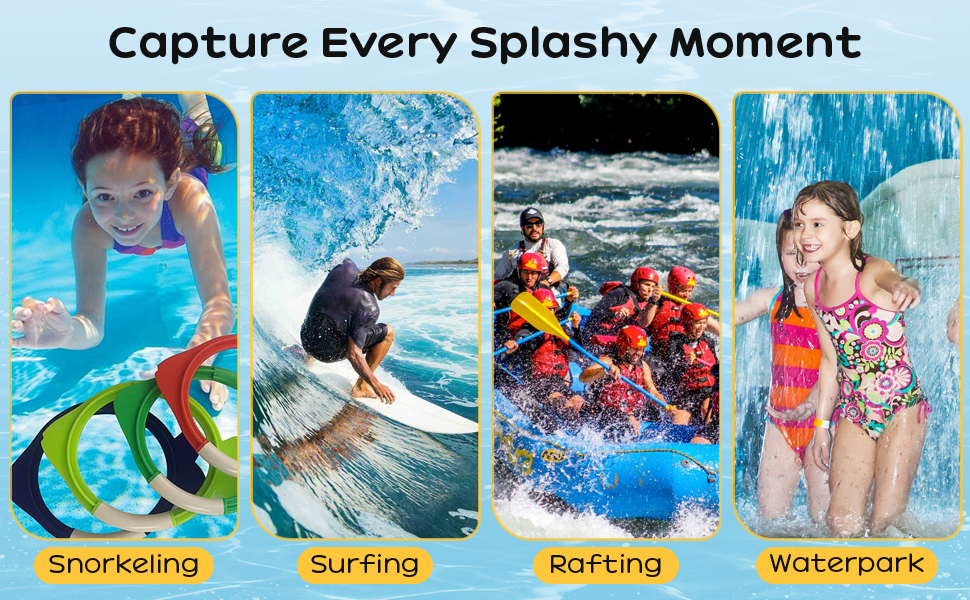 - • Continuous Shooting: Perfect for capturing every moment of excitement while surfing, swimming, and skiing.