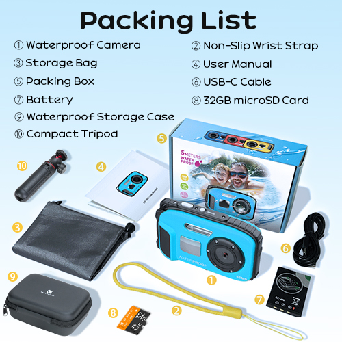 - * 【Durable Build & Handy Carry Case】Crafted from safe, rounded, and impact-resistant materials, this underwater camera for kids is tough enough for every adventure. It comes with a sturdy EVA storage case that’s waterproof, shockproof, and dustproof. The case features both crossbody and handheld options, making it easy and fun for kids to carry wherever their adventures lead!