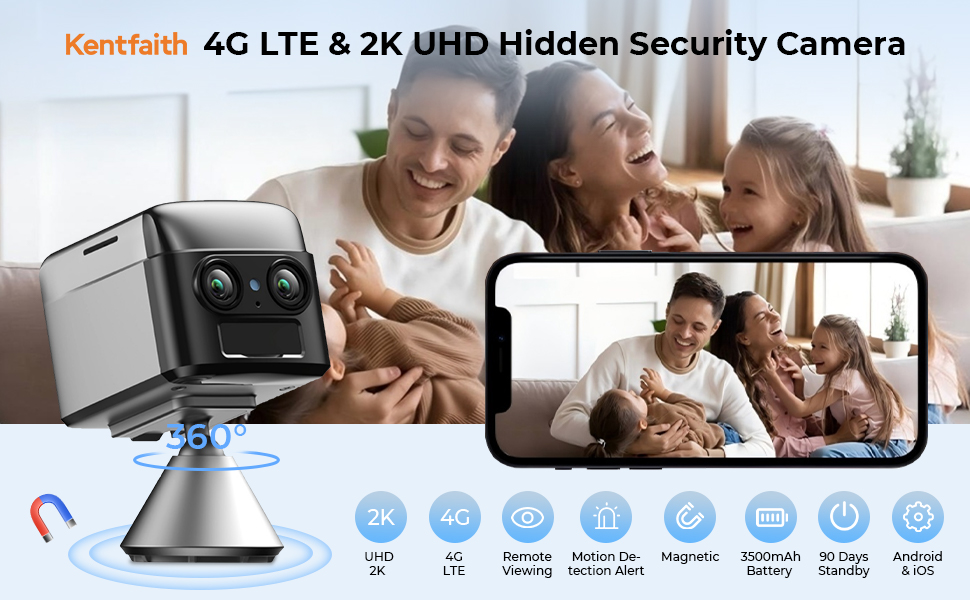 - * Magnetic 360-Degree & 4G Mini Camera: Kentfaith's no wifi security camera offers easy security with 360° rotation and remote 4G monitoring. Compact, magnetic design lets you install it anywhere: home, car, camping trips, or while traveling. Keep an eye on your property, home, or vehicle effortlessly, so you stay secure on the go.