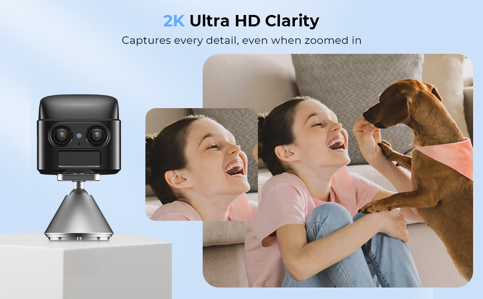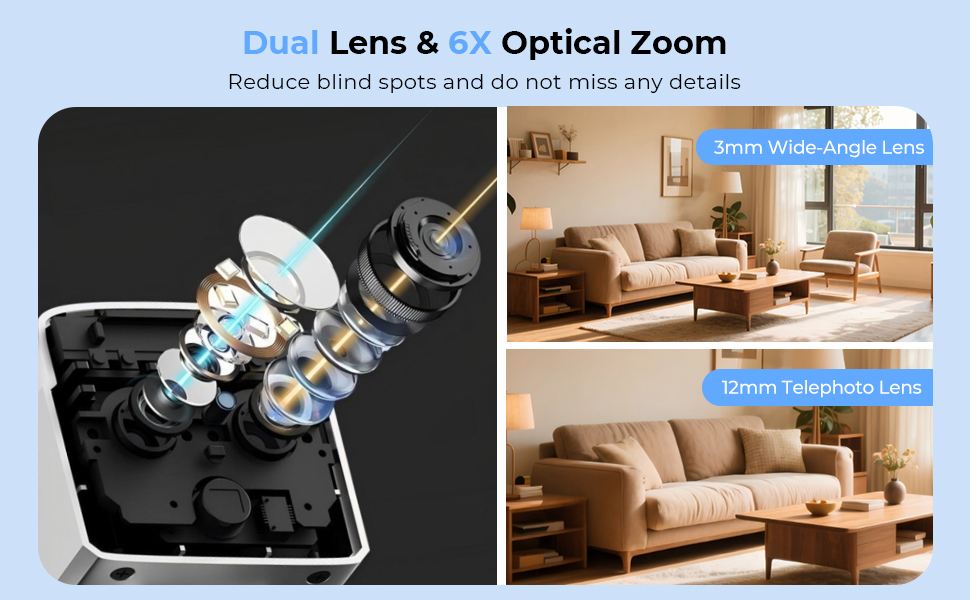 The wireless camera features 2K Ultra HD clarity, capturing sharp details even when zoomed in. With dual lenses (3mm wide-angle + 12mm telephoto) and 6X optical zoom, you won’t miss any details!
