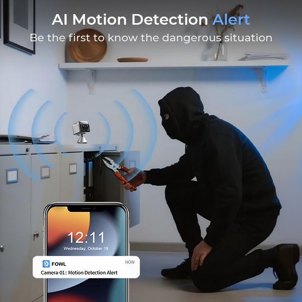 - * Motion Detection Alerts & 2-Way Talk: The PIR HD sensor triggers video recording, filters out invalid video, and sends a timely warning to your phone via the FOWL app to deter intruders within the monitoring range. Plus, equipped with built-in speakers and microphones, the mini camera allows you to communicate with visitors, like intruders and couriers, in real-time—enhancing both safety and convenience.