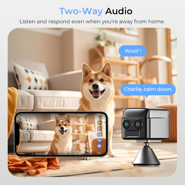 - Our wireless security camera features a noiseless microphone and speaker for instant two-way communication. Easily chat with families, pets, visitors, or deter unwanted visitors using your phone, ensuring you stay connected and protect your property, wherever you are.