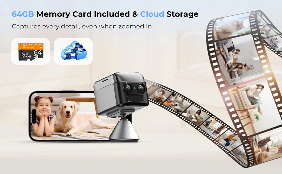 - * Supports Local Storage & Cloud Storage: The wireless camera supports both cloud storage and SD card (64GB SD card included, supports 8-256GB). Mini security camera runs without WiFi and stores videos directly on the SD card, perfect for environments with unstable networks. Loop storing ensures continuous video coverage without worrying about memory issues