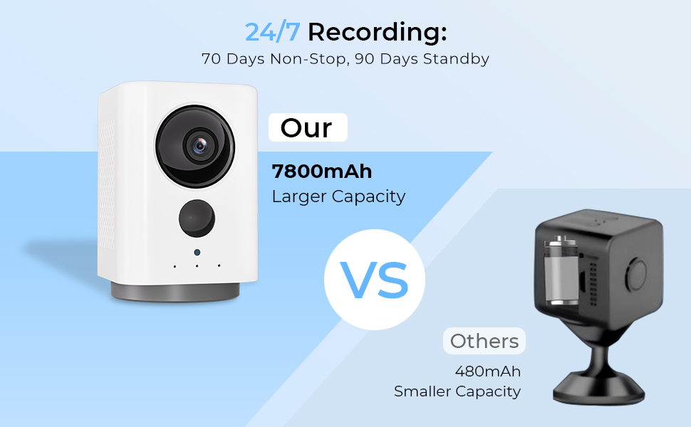 The battery life is amazing! With a large 7800mAh capacity (way bigger than others’ 480mAh), it supports 70 days of non-stop recording or 90 days of standby. Even with daily motion triggers, you won’t need to charge it for months—perfect for hassle-free use!