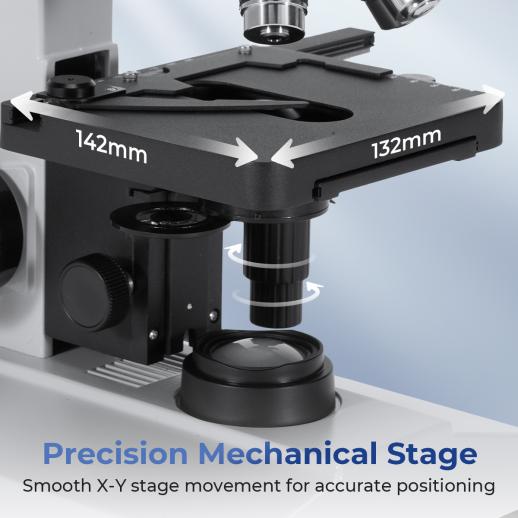 - * Precision Mechanical Stage & Fine Focus: The double-layer 132×142mm stage with 0.1mm-precision vernier calipers allows smooth X-Y navigation, so you can easily log coordinates and return to any point of interest. The coaxial coarse & fine focus system (0.015mm precision) lets you lock onto your target plane in seconds, saving valuable time during extended research sessions.