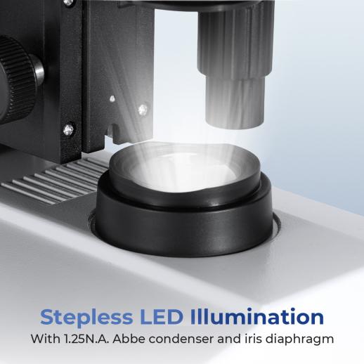 - * Adjustable Abbe Condenser & Stepless LED Light: Featured a height-adjustable Abbe condenser (N.A. 1.25) with a variable iris diaphragm, our compound microscope gives you precise control over contrast and resolution to match any specimen and technique. The high-brightness bottom LED light source features stepless dimming, so you can dial in the perfect intensity.