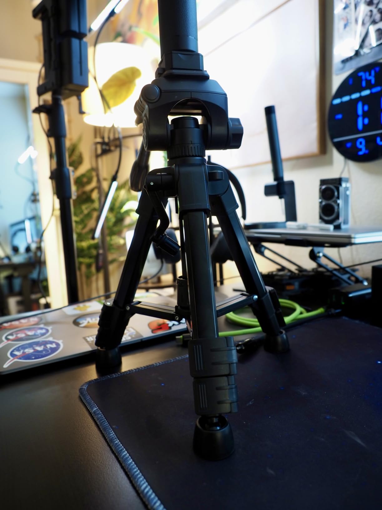 I bought this mini tripod for my home office setup and it's excellent value for money considering how versatile it is! It's super lightweight at just over a pound, so I can easily move it around my desk or throw it in my bag without any hassle. I love how easy it is to use - adjusting the height is smooth and quick, and the quick release plate lets me swap between my camera and phone in seconds. Despite being so compact when folded, it's surprisingly stable and holds my mirrorless camera without any wobbling at all. The pan and tilt head gives me all the angles I need for video calls, product photos, and even some casual vlogging!