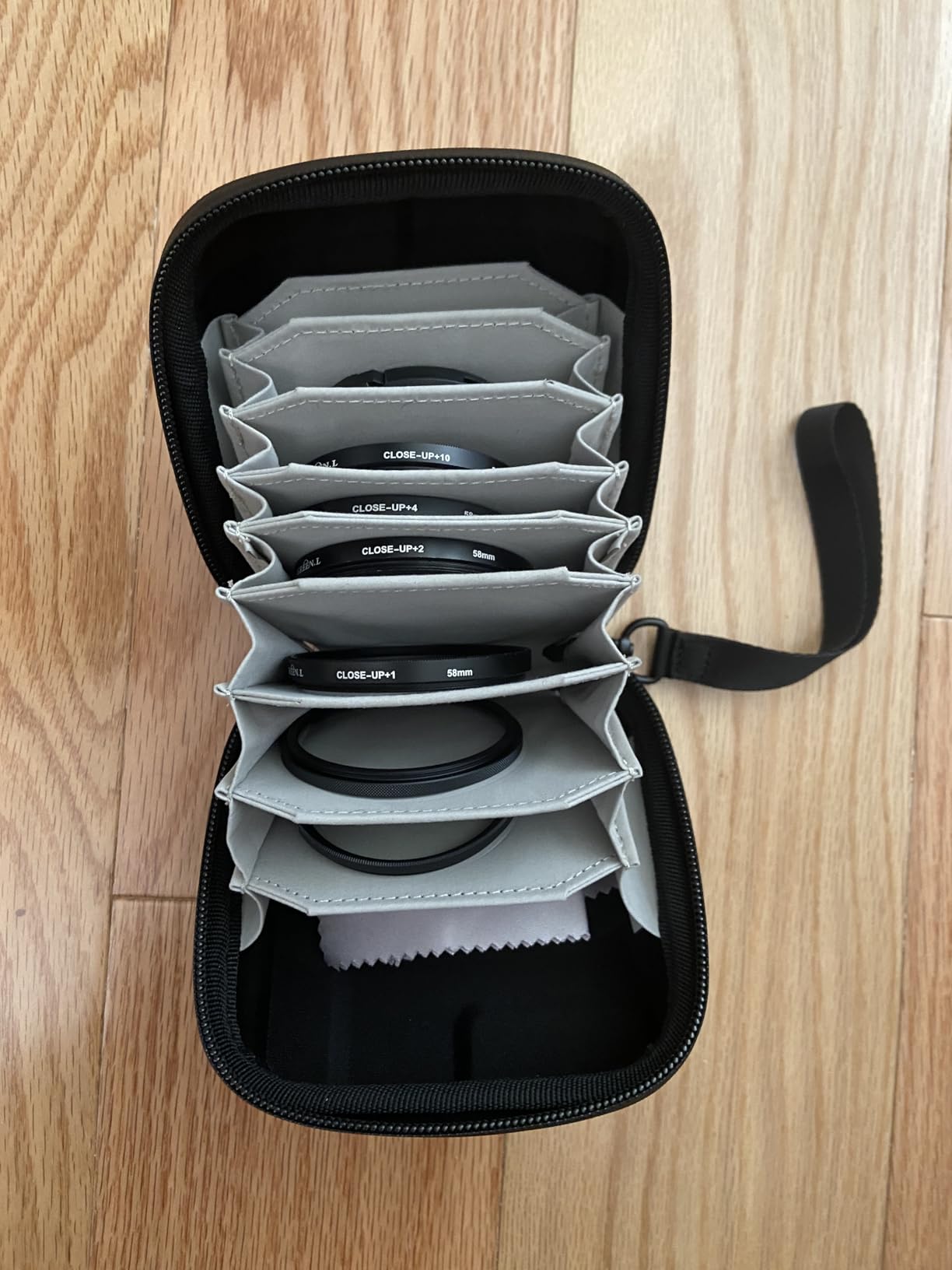 This high-quality hard-shell camera filter case has a storage capacity of up to 10 filters that are no larger than 82mm. It functions as designed; however, in my experience, it’s not suitable for filters smaller than 52mm, as they may slide around and scratch each other. The case is user-friendly, featuring a zipper that opens and closes easily. Additionally, it’s waterproof, making it ideal for transporting filters and traveling. Note: if your filters have a thick profile, you may not be able to fit all ten filters and still close the case tightly with the zipper.