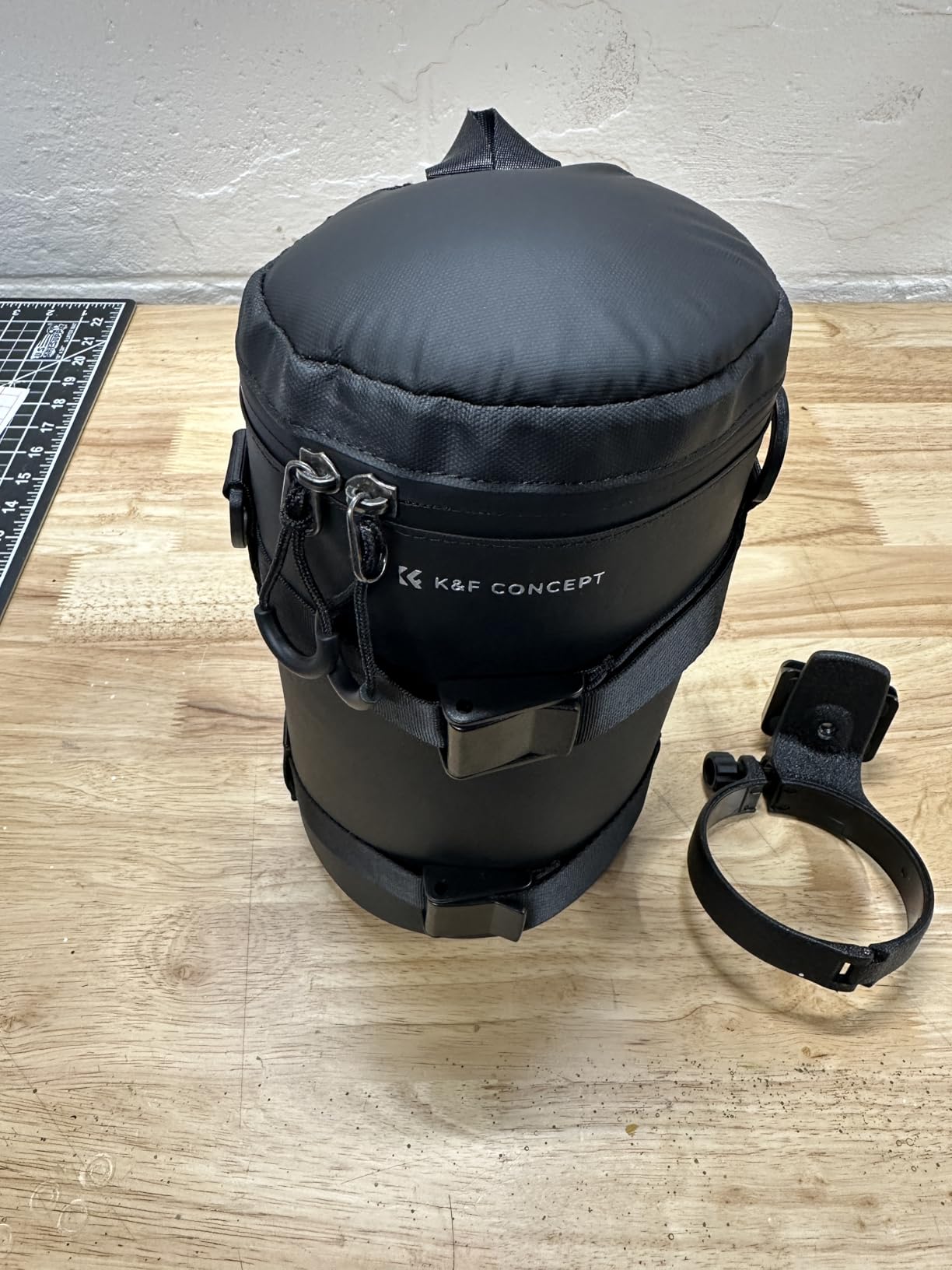 I’m continuously impressed with KF Concept. I was surprised by their filters and I’m in love with this case. I needed something to lug around my 80-200 as it was DOMINATING my camera bag. This case fits the bill, it’s sleek, seems to be reasonably well constructed, padding seems taught and malleable. It’s got a nice assortment of hooks and straps to make it easy to affix to other things. And it came with a little duster.