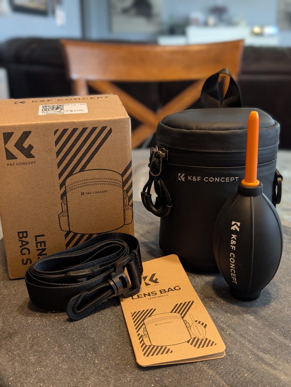 The pouch is small - approximately the size of a 12 oz. cola can, but with plenty of padding that will protect your lens from any sort of dents and dings and scuffs. The zipper and stitching on the case is top notch - very well put together and securely sewn. The inside lid of the pouch has a small mesh pocket for storing filters or memory cards or anything of similar small size. There are two strap connection points on each side of the exterior of the case that allow you to connect the included cross body strap. There is also a small hanging tab sewn into to hang the case from a carabiner. K&F also includes a free bulb blower with the case for added convenience.