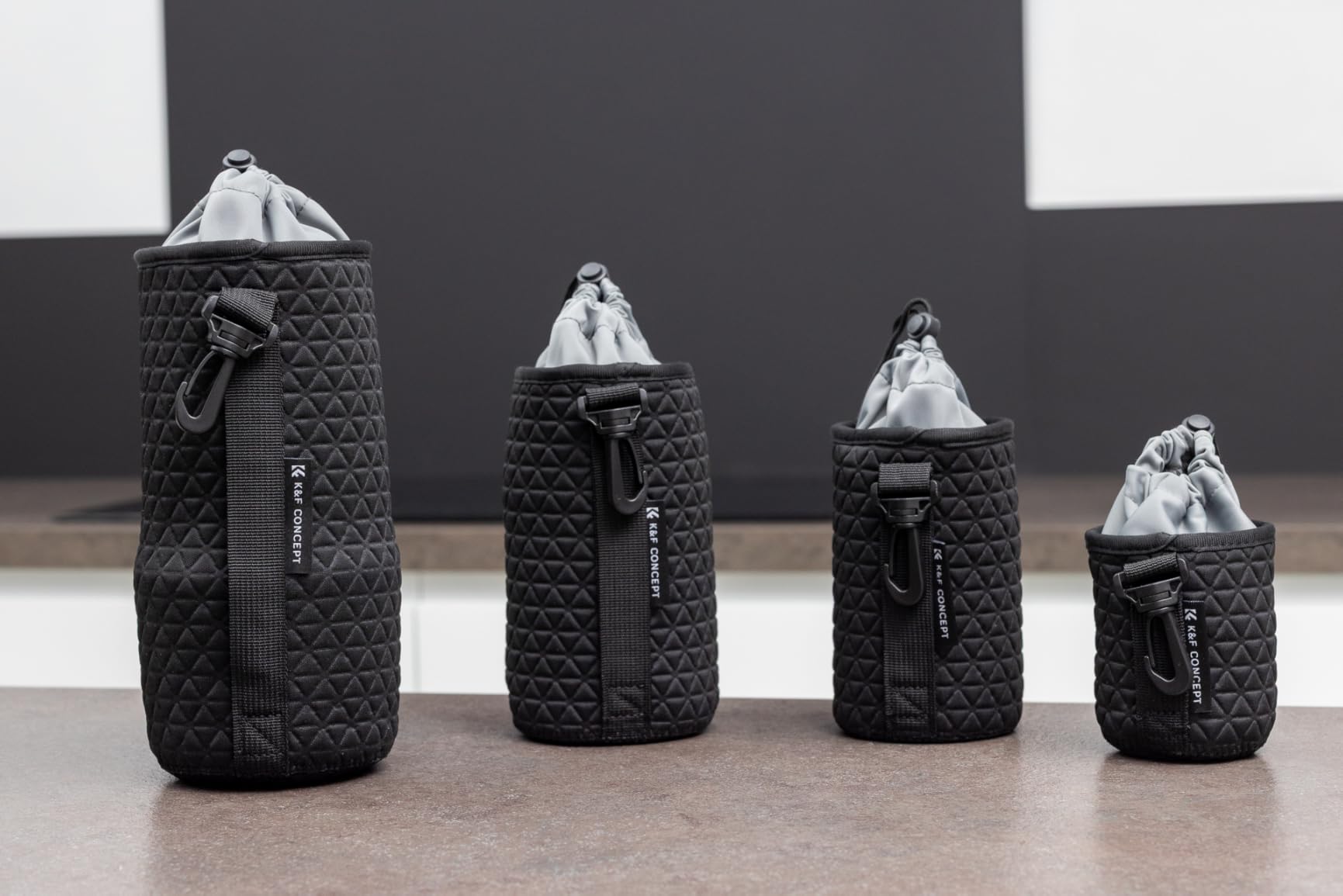 The four sizes are incredibly practical. Whether it's a small pancake lens, a medium standard zoom, or a telephoto lens, everything has its place. They're also great for filters, batteries, or other accessories. The drawstring with a sturdy clip makes it easy to attach each case to a backpack, belt, or similar item. Perfect for outdoor shoots.
