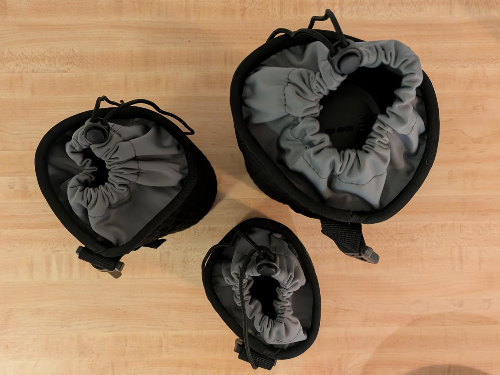 These are about twice as thick as the stock bags that came with these Nikon/Nikkor lenses, and unlike the Nikon bags, the straps on these have little cinches so that you can keep them closed tight.