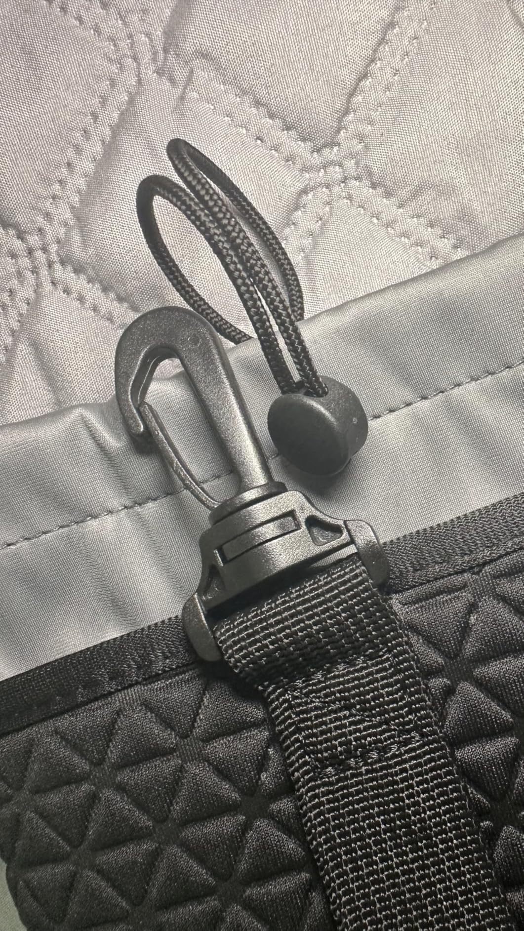 Secure closure with a drawstring and carabiner clip.