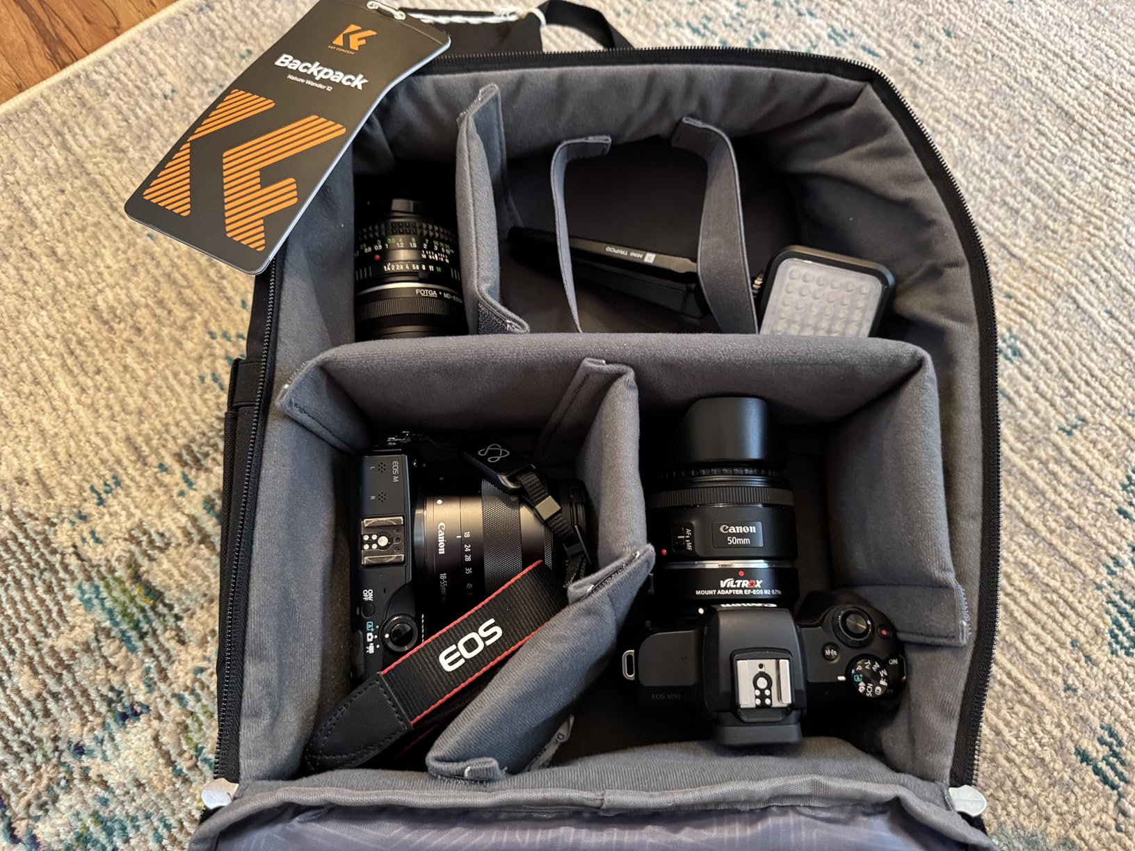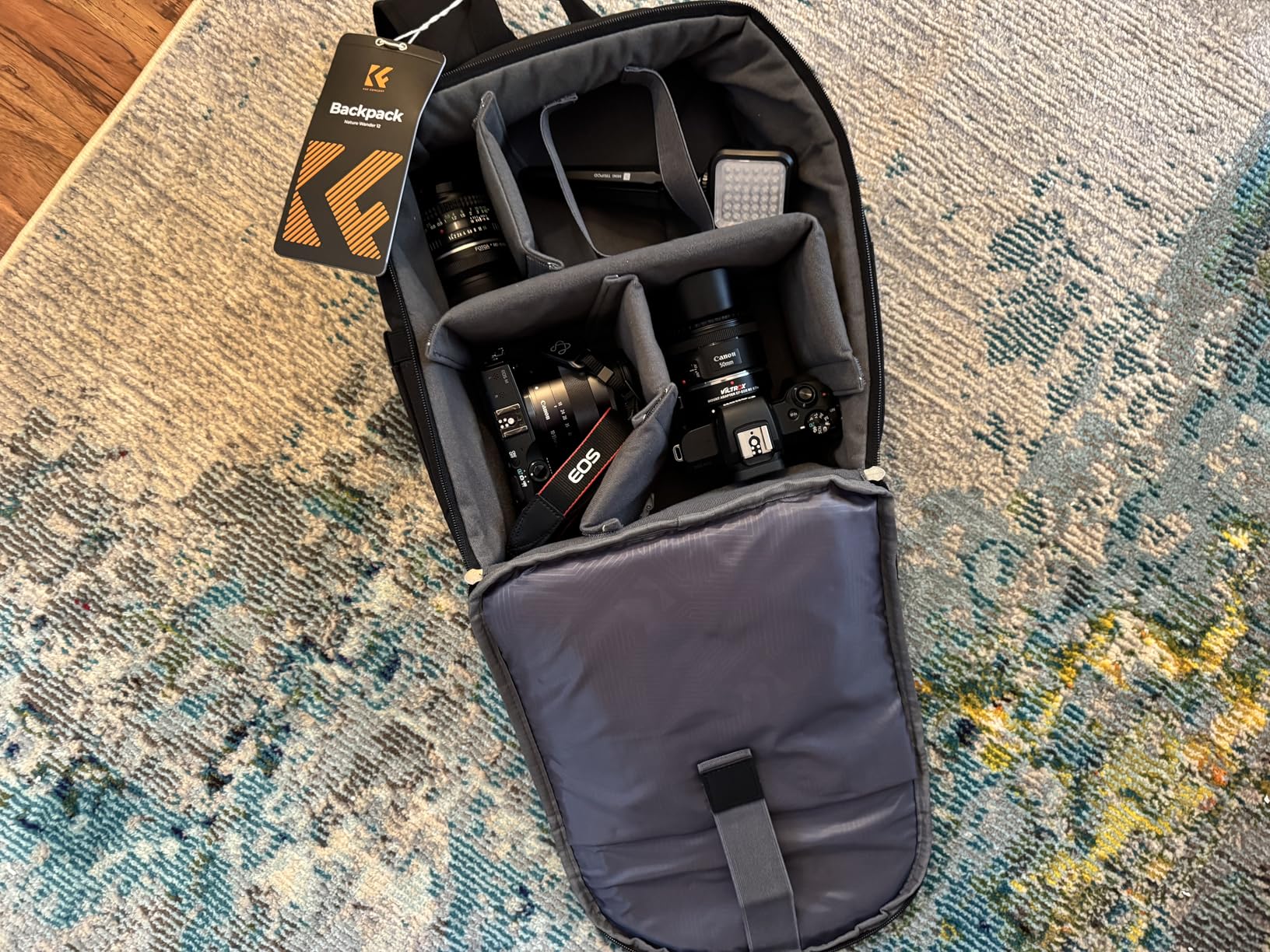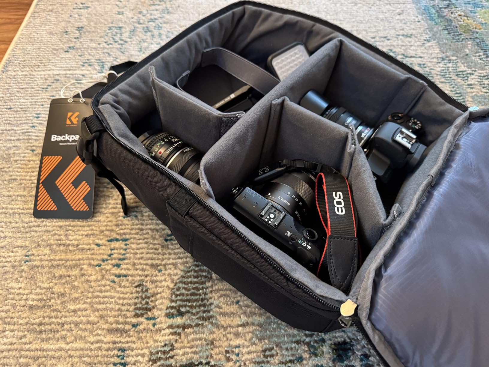 I purchased this K & F Concept camera backpack because I was looking for safe and secure way to bring my camera gear abroad and having the right portability option would encourage me to take the cameras more frequently. This camera backpack has a fully customizable interior space and can be sub-divided with the included Velcro attached soft dividers. This has so much flexibility with customization for fine tuning what you can carry in the bag. Has a fantastic material construction and includes a water protection rain cover. If can also function as regular backpack. Great outside pockets. Hold my EOS camera securely and confidently. Looks great, looks professional. Never disappointed in K & F Concept gear. Highly recommend this if you have camera gear that you want to take with you but haven’t found the best solution to the portability dilemma. Can also bring a tripod along with the side pocket holder, fantastic bag.