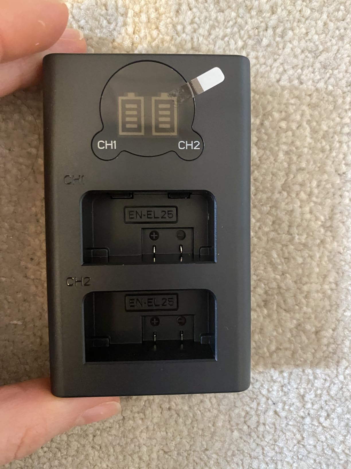 I have a Nikon Z50 that uses the EN-EL25 – I used to charge the battery in the camera, but now I’ve got a charger I can keep plugged in and just pop the battery in when I need. I really wish the design of this had the indicator lights on the other side of the battery. When you put the batteries in, they block the view of the indicator assuming the cord is at the back. It works, it charges, but I wish I didn’t have to stand over it to see the light just to see if it’s done charging. Using the batteries that come with it, they seem to work as well as any of the OEM ones.