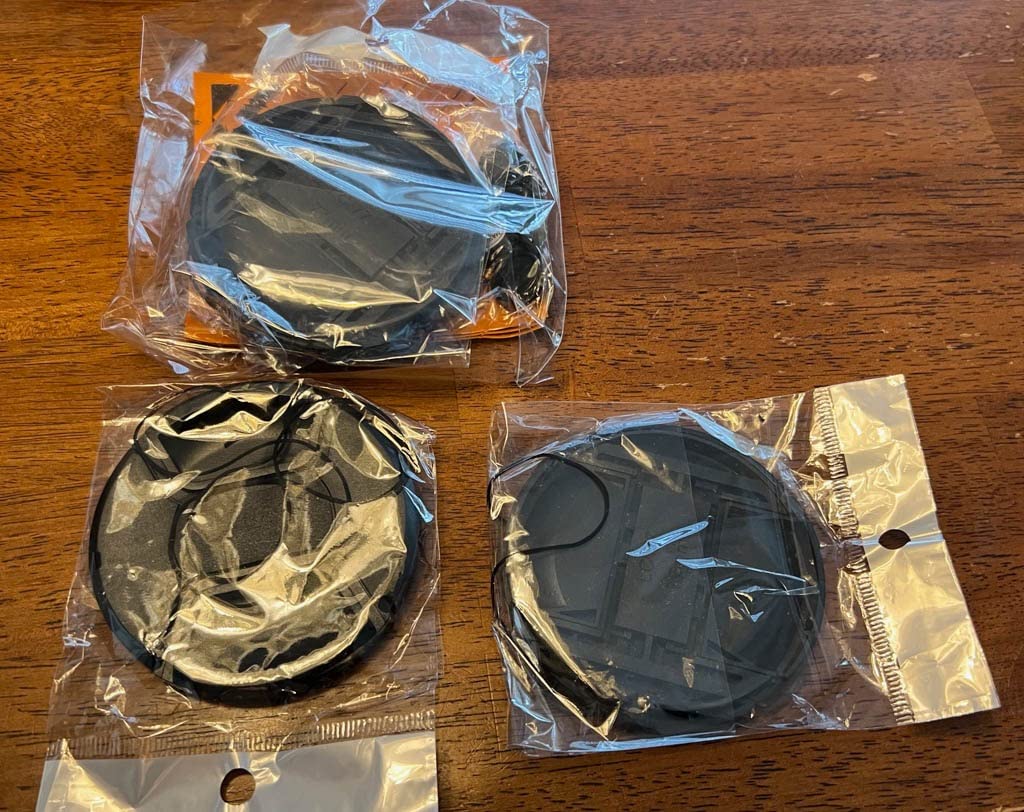 Ordered these as an alternative to my old-style Canon lens caps. I like the pinch-style caps and at with three in the set they only cost a few bucks each which isn't too bad at all, and if you only need one, hey, you've got spares!They fit my 67mm lenses and stay on about as well as the Canon pinch caps do, which is to say they come off easily if you so much as bump the pinchy sides. Also like the Canon caps they're a bit 'orientation sensitive' in that certain orientations don't grip the filter thread as well as others and come off just a bit easier.The caps come with three packaged microfiber cleaning cloths, three sets of lens cap keepers, and three long pieces of stretchy string. I haven't lost a lens cap yet but given how easily the pinch caps come off the lens cap keepers might be a really good idea!As far as the string, well, who knows. Maybe someone will figure it out.