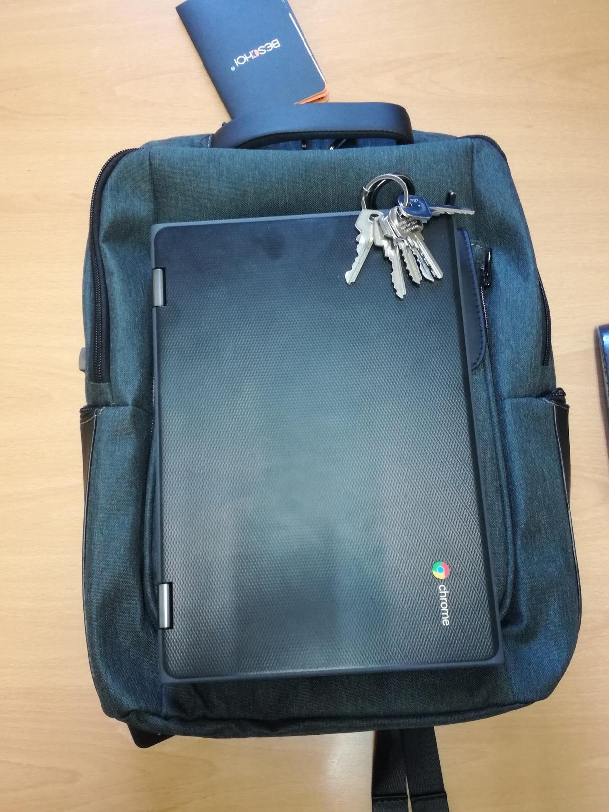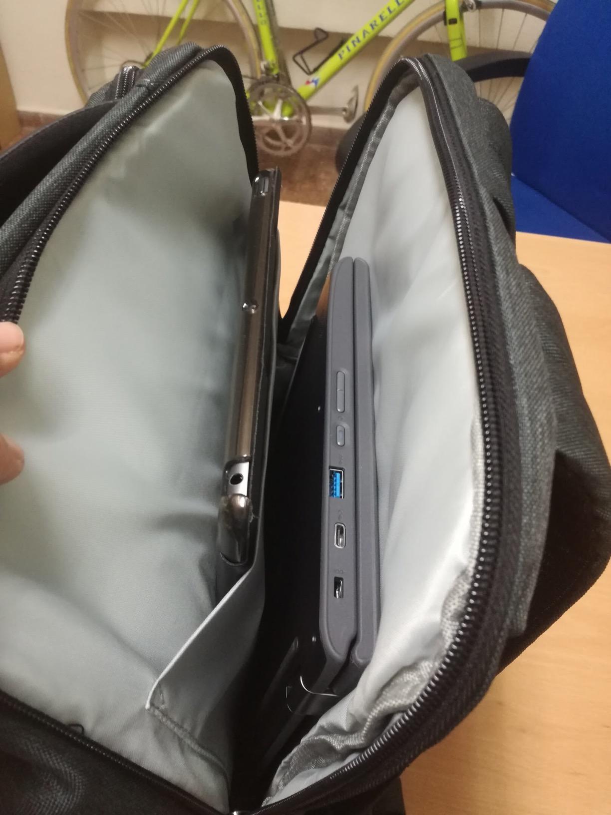 Just what I was looking for. Ideal compartments for the Chromebook and the tablet; another compartment for a folder, books, a pencil case, a mobile battery, various pockets...; two side pockets for some odds and ends; a “collapsible” bag the size of a tablet (I now use it to put a couple of masks in and have them at hand when I get off the bike). Good, wide, padded straps, a very useful handle on the top (more than it seems). The size is ideal for my interests: the folders fit comfortably and it is thick enough to carry what is necessary (without it ending up being a school backpack); and what I liked most is that it fits perfectly in the trunk of the bike, what I was looking for!