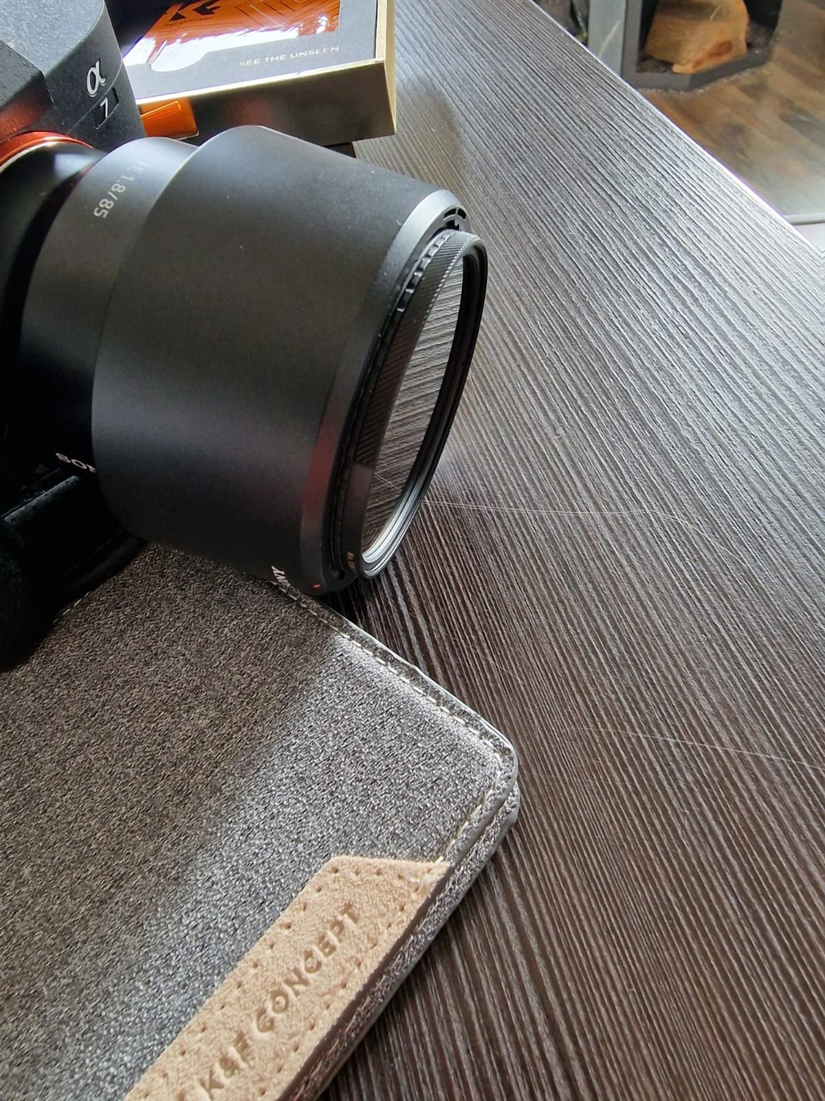 You will receive a bag with leather parts, which is softly lined on the inside and is used to store the filter. In addition, an extra packed cleaning cloth is included. The bag has a magnetic closure and is very well made all around. The filter itself is also very well made, it has a brass frame and can be easily screwed onto my two lenses. Turning the filter to adjust also works well. Due to its slim design, the filter also does not apply too much to the lens.