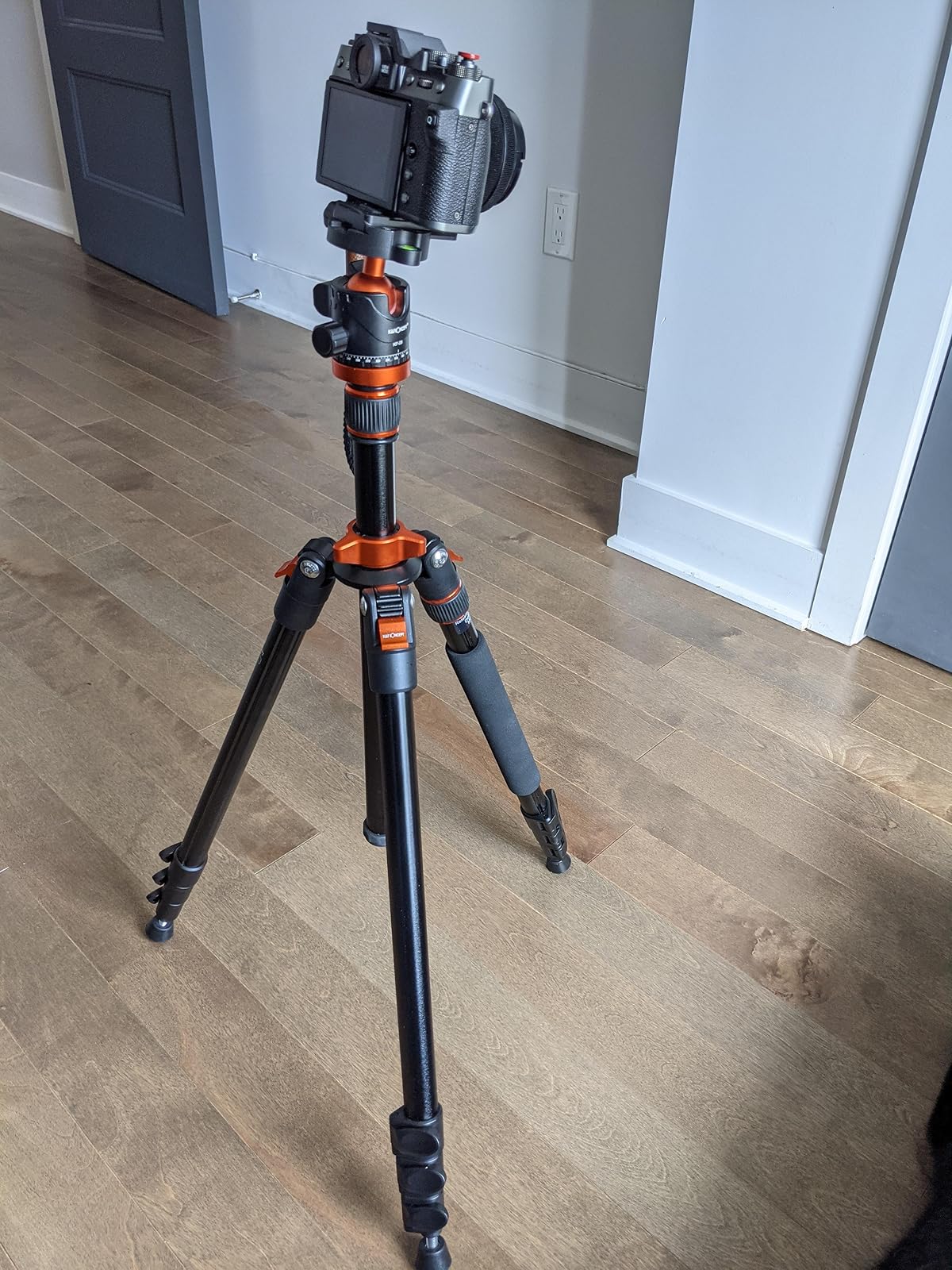 I'd give this a five star but for the ball head. It doesn't lock well with a spotting scope or a heavy lens and camera body on it. I ended up buying a Neewer pan/tilt head, which fortunately fits the K&F tripod well. Other than that, it is a decent piece of equipment. Just keep in mind, it is a travel tripod, and won't give you a solid mount impervious to wiggling from wind or hand adjustments. For that, I continue to look for that elusive affordable tripod.