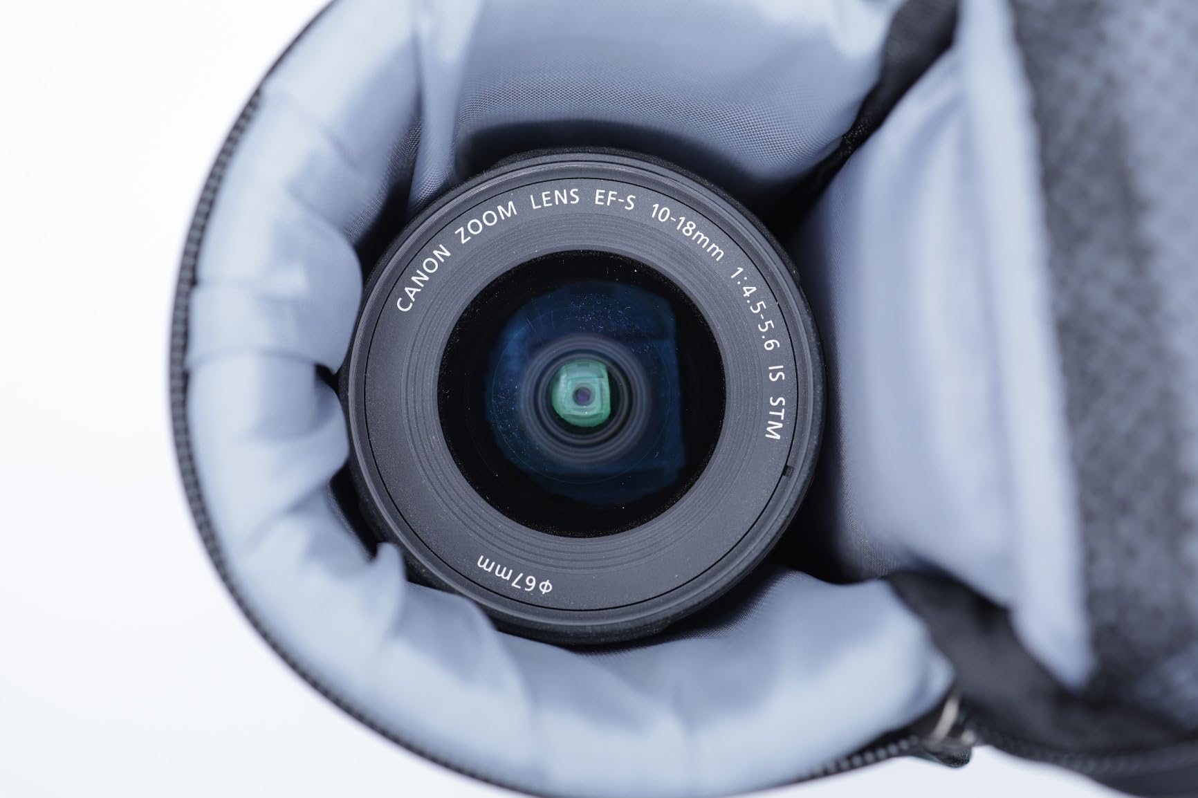 I've had this bag in size M for a month and no longer had a lens that “roamed around” freely in my pocket. It fits perfectly for an EF-S 10-18mm lens when you remove the lens hood. Of course, I can also accommodate smaller lenses, such as my RF 35mm f/1.8. They may wobble in it, but since the bag is padded, that's no problem.