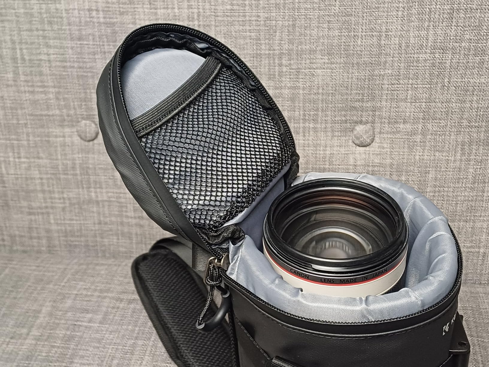 The size guide is very useful and practically accurate so use it, here I am using an L case for a Sony 18-105mm lens and there is enough space left to include an ND filter in its box inside the bag.