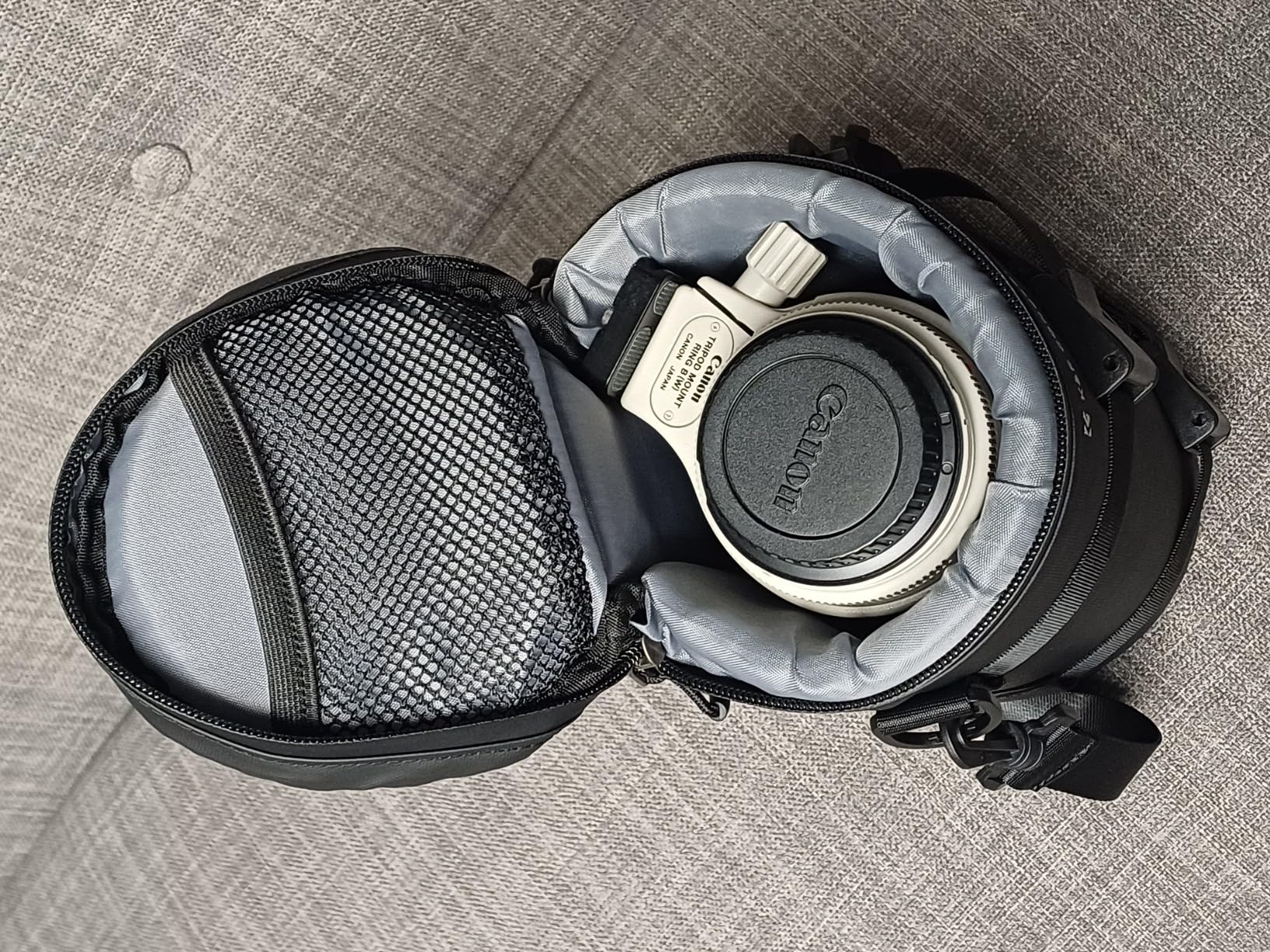 As I opted for the 'small' size, I tested one of my lens converters inside the bag, which fit perfectly. I would say that most 50mm and below lenses could also be slotted in.