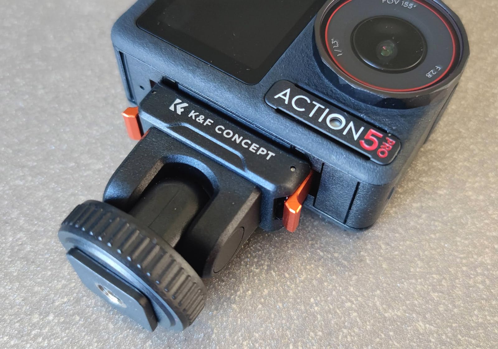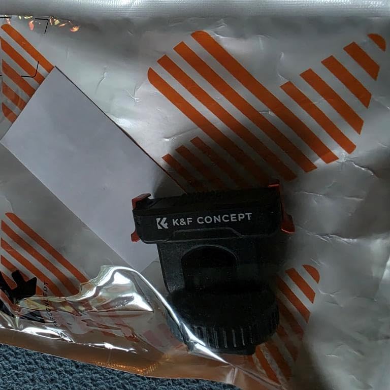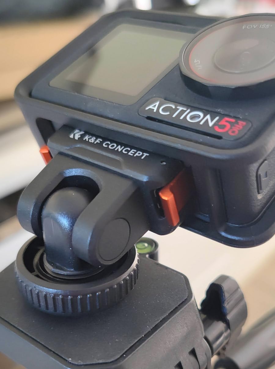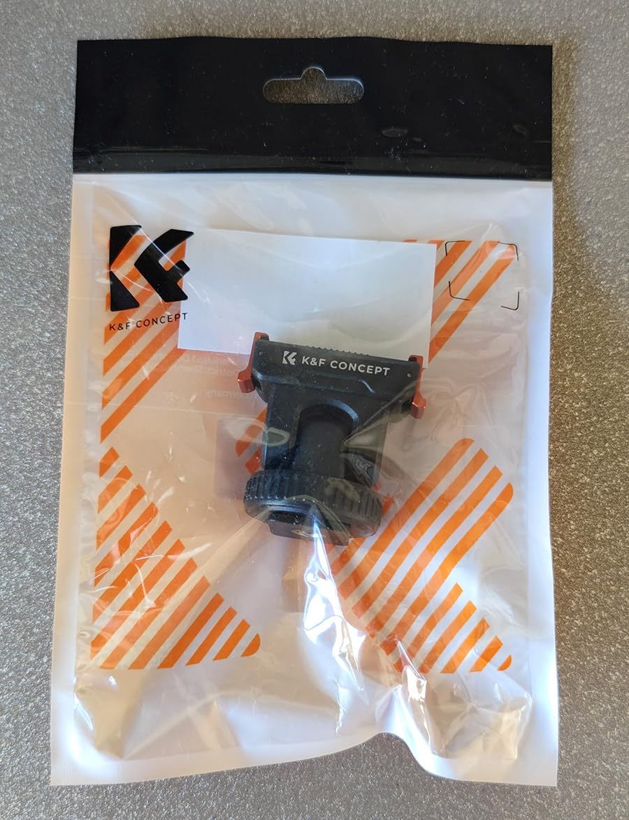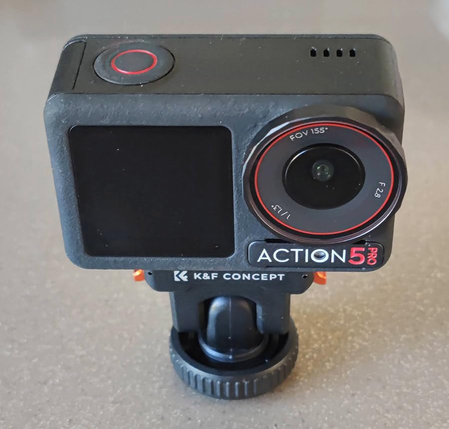 This mounting for the DJI Osmo action cameras from K&F Concept comes in a simple plastic window pouch along with a small product information sheet.The mount attaches to the magnetic clip on the action camera or the plastic frame if you have that installed, and gives the option to mount the camera on either a camera's or accessory's shoe clip, or to bolt it onto a tripod using the standard 1/4-inch thread.The mount has orange aluminium alloy clips either side to latch onto the action camera together with the magnetic clamp. This means it's not reliant on the magnetic properties which often aren't sufficient to hold the camera alone. The clips operate smoothly without too much spring resistance, and hold the camera in place very effectively. There is also a silicone ribbed pad on the base to prevent slippage and provide a little cushioning.The top part of the mount can be tilted forwards and backwards. It only uses friction to hold it at the selected angle, so this pivot point has the potential to wear over time and become looser. There's also no notch feeling to help indicate when the mount is moved back to the vertical position which would be useful.The cold shoe attachment has a clamp ring which can be tightened to keep the mount in place.The 1/4-inch thread on the base is made from brass and has good depth which should accommodate the bolts found on most tripod and other camera clamps.In use with our Action 5 Pro camera the mount snapped into place, held the camera securely, released it readily when the side clips were squeezed, and looked very professional.This mount is well-made and gives some nice extra secure mounting options. We use tripod-mounted cameras quite a bit, so having the Action 5 Pro now able to use them too is a great bonus.