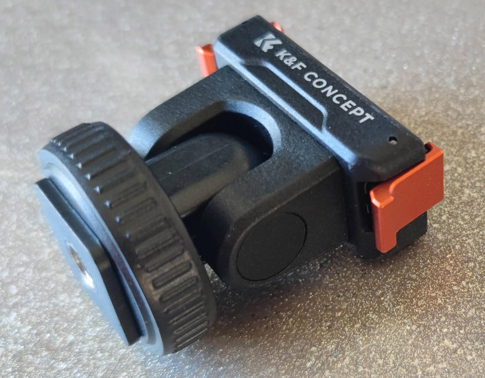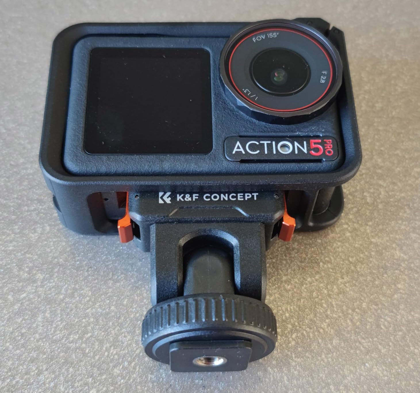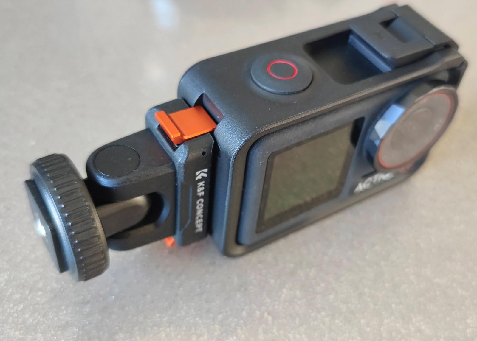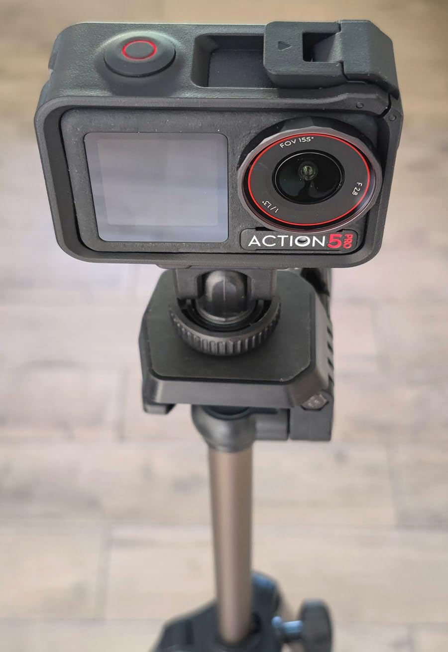 This mounting for the DJI Osmo action cameras from K&F Concept comes in a simple plastic window pouch along with a small product information sheet.The mount attaches to the magnetic clip on the action camera or the plastic frame if you have that installed, and gives the option to mount the camera on either a camera's or accessory's shoe clip, or to bolt it onto a tripod using the standard 1/4-inch thread.The mount has orange aluminium alloy clips either side to latch onto the action camera together with the magnetic clamp. This means it's not reliant on the magnetic properties which often aren't sufficient to hold the camera alone. The clips operate smoothly without too much spring resistance, and hold the camera in place very effectively. There is also a silicone ribbed pad on the base to prevent slippage and provide a little cushioning.The top part of the mount can be tilted forwards and backwards. It only uses friction to hold it at the selected angle, so this pivot point has the potential to wear over time and become looser. There's also no notch feeling to help indicate when the mount is moved back to the vertical position which would be useful.The cold shoe attachment has a clamp ring which can be tightened to keep the mount in place.The 1/4-inch thread on the base is made from brass and has good depth which should accommodate the bolts found on most tripod and other camera clamps.In use with our Action 5 Pro camera the mount snapped into place, held the camera securely, released it readily when the side clips were squeezed, and looked very professional.This mount is well-made and gives some nice extra secure mounting options. We use tripod-mounted cameras quite a bit, so having the Action 5 Pro now able to use them too is a great bonus.